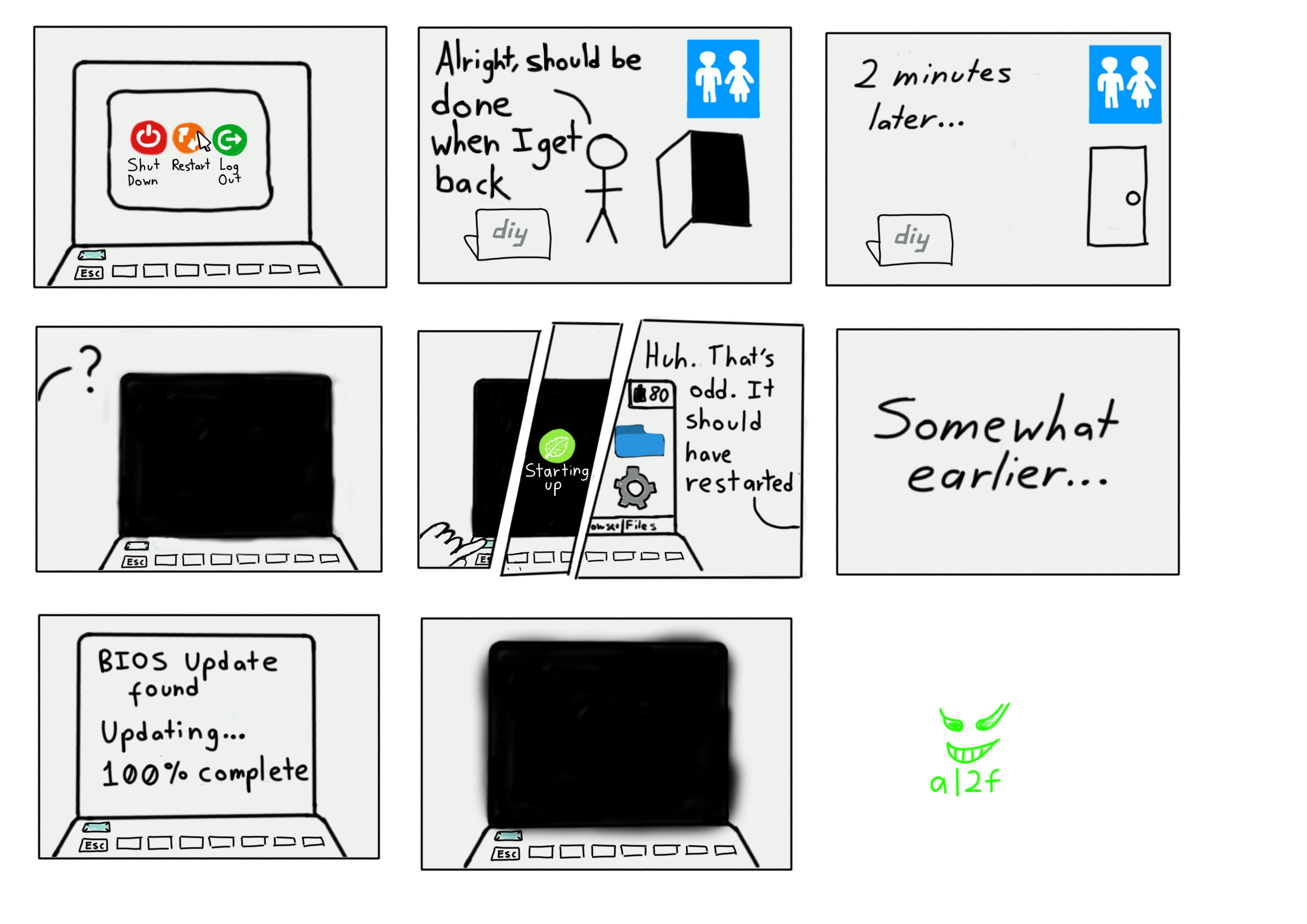 - A montage of the laptop screen as it turns on, split diaognally into 3 parts. First, a black screen and a finger on the power button. Second, a green logo of a mint leaf and the text “Starting up”. Third, the laptop turned on with the desktop visible. Person: “Huh. That’s odd. It should have restarted”. It seems the laptop chose to ignore the command to restart, and instead chose to power off!