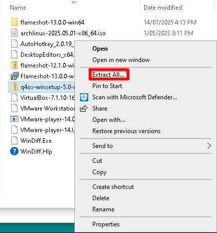 Go to your downloads folder, and unpack the q4os-winsetup zip file by right-clicking on it and selecting ‘Extract all’.